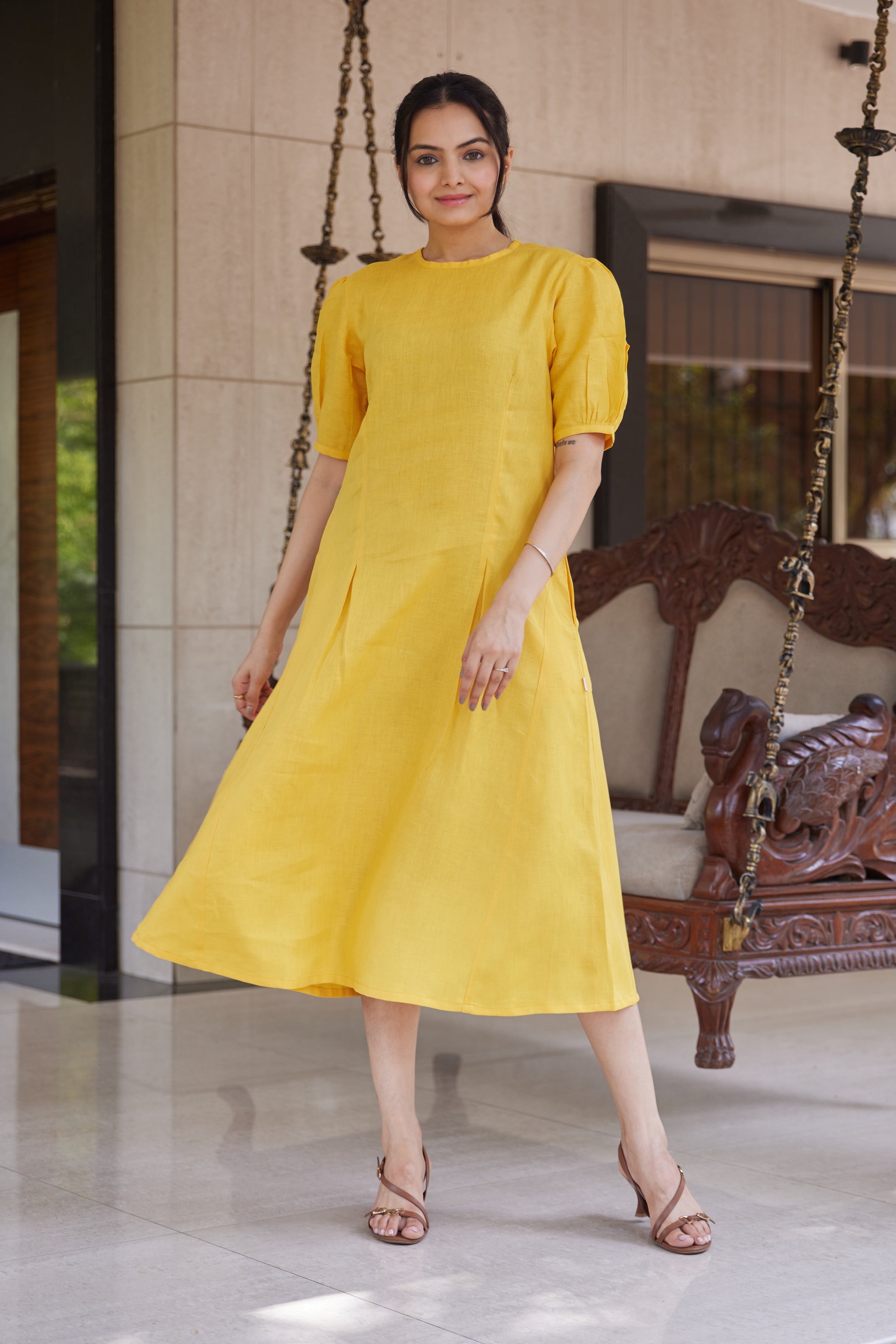 A burst of sunshine in every step—this vibrant yellow midi dress is designed to lift your mood and your wardrobe.Tailored from 100% pure linen, it features a structured round neckline, softly gathered puff sleeves, and gentle pleats that fall into a breezy silhouette. A concealed side pocket adds just the right touch of function to this feel-good, all-day piece.