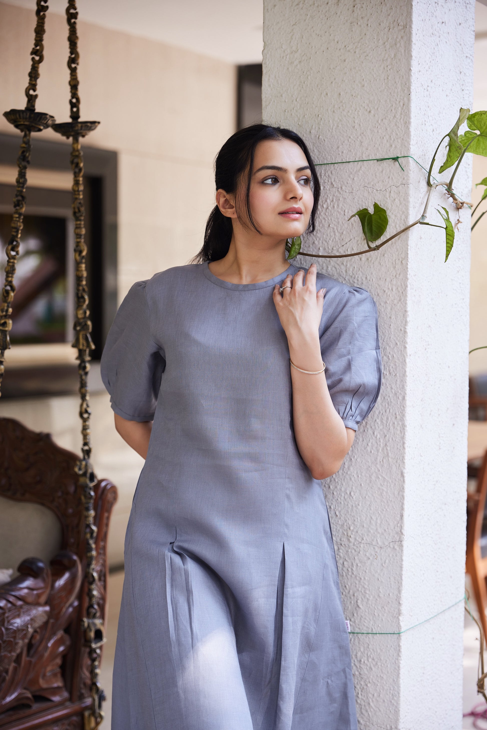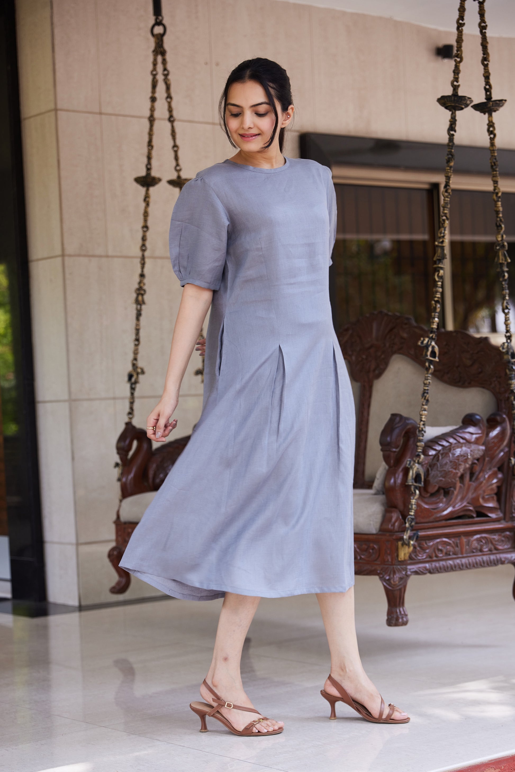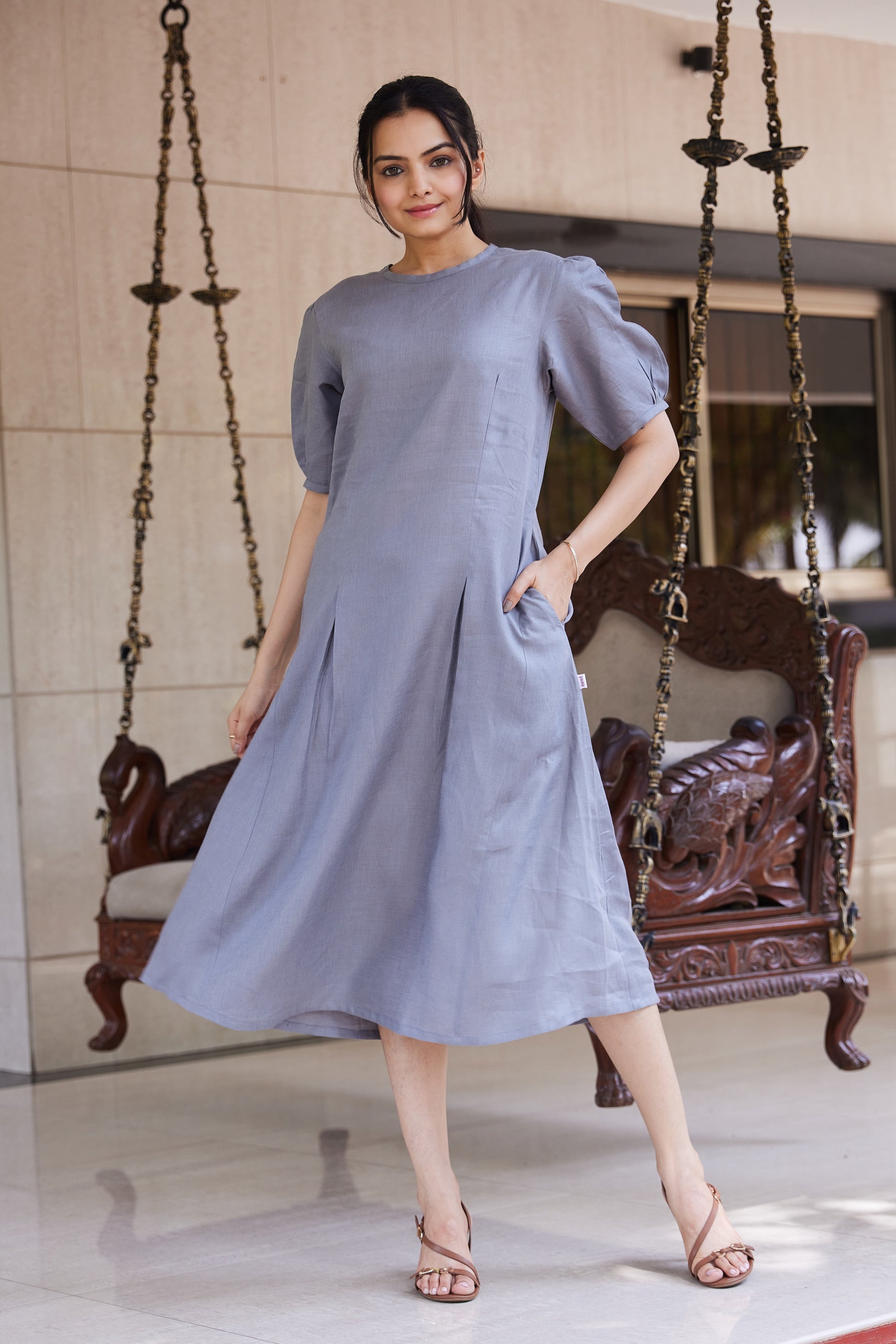 Minimal yet memorable—this grey midi dress is a quiet statement in effortless elegance.Crafted from breathable 100% pure linen, it features a clean round neckline, tailored short sleeves, and soft pleats that create gentle movement. With a hidden side pocket for practicality, this dress is made for slow days, strolls, and everything in between.