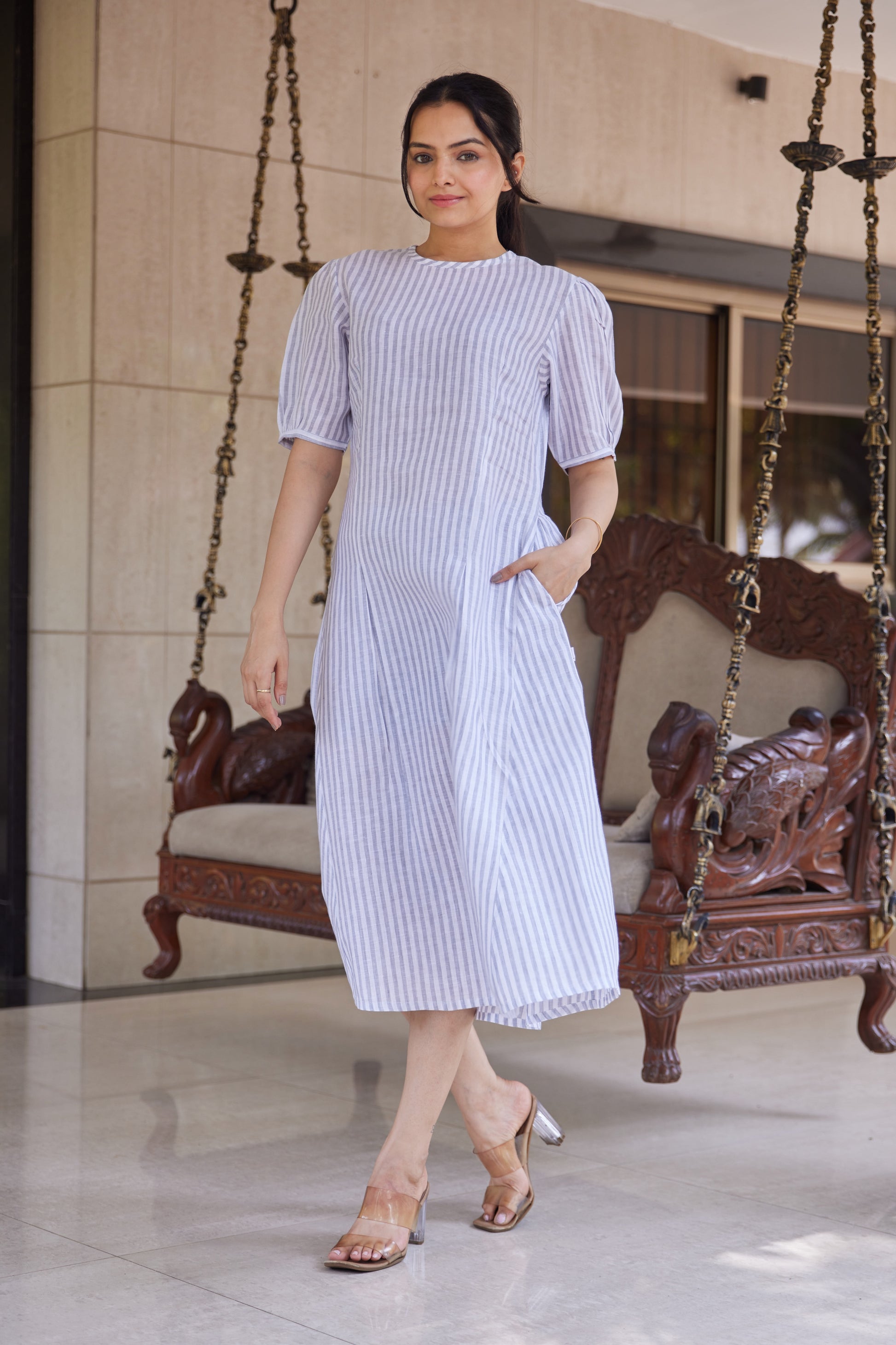 Understated yet graceful—this grey striped linen dress is a quiet nod to timeless style.Crafted from 100% pure linen, it features vertical stripes in soft grey and off-white, creating a clean, elongating silhouette. With puffed sleeves, a classic round neckline, and thoughtful tailoring, it balances structure with ease—ideal for breezy mornings and slow afternoons.
